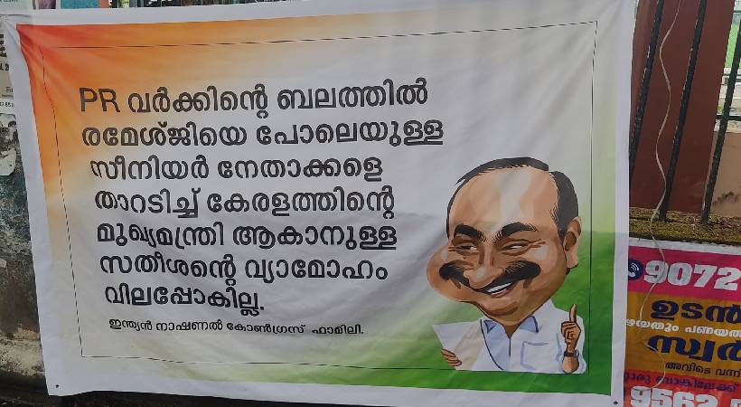 രമേശ് ചെന്നിത്തല പോലുള്ള മുതിർന്ന നേതാക്കളെ തള്ളിക്കളയുന്നതിലൂടെ സതീശൻ മുഖ്യമന്ത്രിയാകാനുള്ള മോഹം സാക്ഷാത്കരിക്കാൻ കഴിയില്ലെന്നാണ് ഫ്ലക്സിൽ കുറിച്ചിരിക്കുന്നത്. കോൺഗ്രസ് ഫാമിലി എന്ന പേരിൽ പ്രചരിപ്പിക്കുന്ന ഫ്ലക്സിൽ, ‘യുഡിഎഫ് ജയിക്കും, വി.ഡി. സതീശൻ നയിക്കും’ എന്ന് എഴുതിയിരിക്കുന്നു.